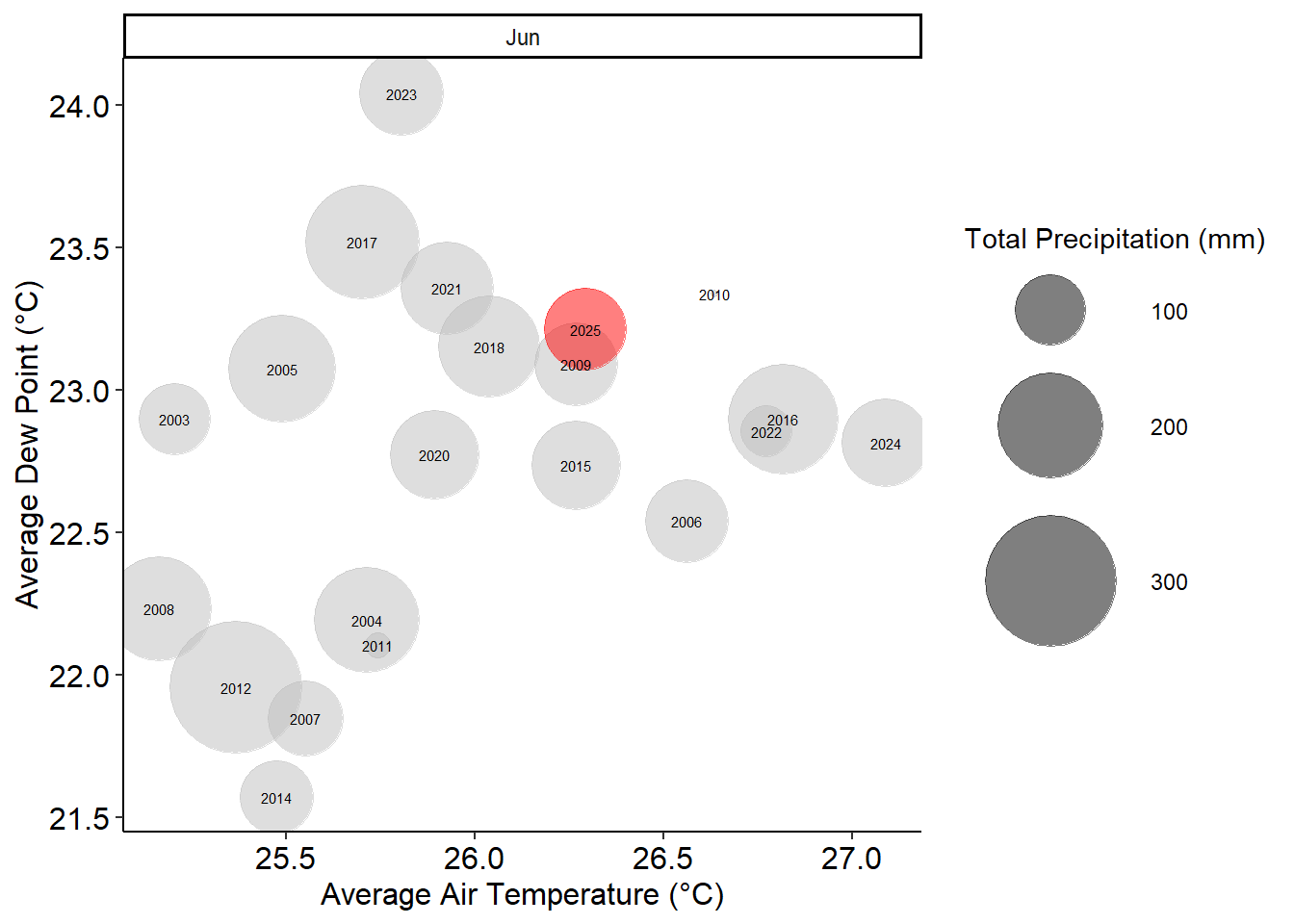Overall, mean monthly temperatures in January, March, May, June, and November were higher than average (Figure 6.4), with November having the highest anomalies recorded in that month. February, April, September, and December of this year were cooler than average. . The highest average air temperature ever recorded at the GTMNERR weather station was recorded in June 2024 (Figure 6.5).