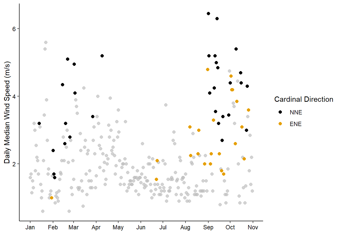 Using duration of wind directions between 0-100 degrees for greater than 24-hrs at the Pellicer Creek weather station, 13 “Nor’easter” events were identified in 2025 (?tbl-neer). Occasionally, localized wind directions result in values outside of this 0-100 degree window. The longest Nor’easter event occurred October 16th - October 19th, lasting 74.5 hours (?fig-winds-long). This table does not identify wind strength during these events, just the time frames in which winds were originating and prevailing in the 0-100 degree directions (Figure 6.1).