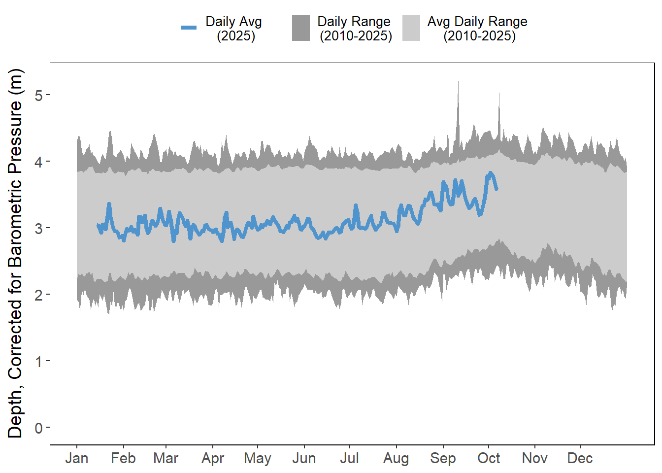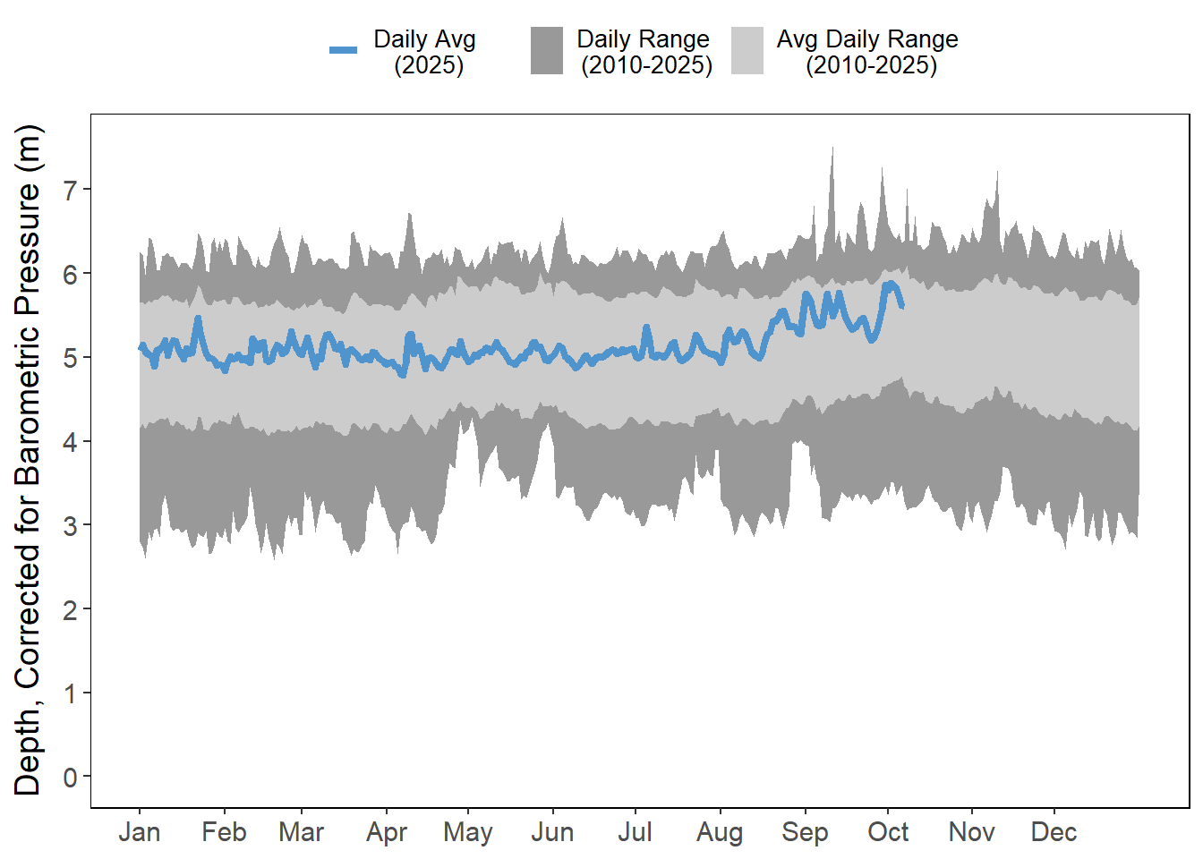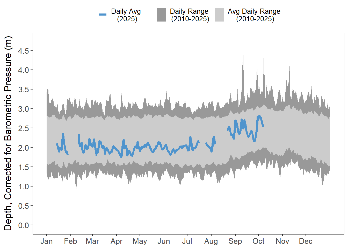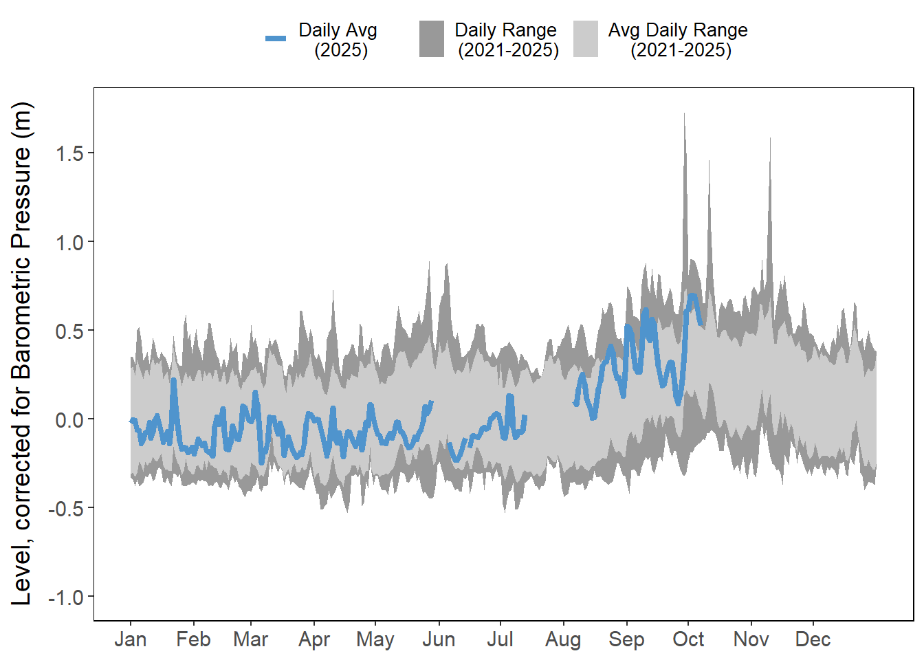 Note that the water level data at Pellicer Creek only includes data from 2021–2024, which is due to this station switching from reporting depth to reporting level (NAVD88) in 2021 (Figure 6.3 (d)).