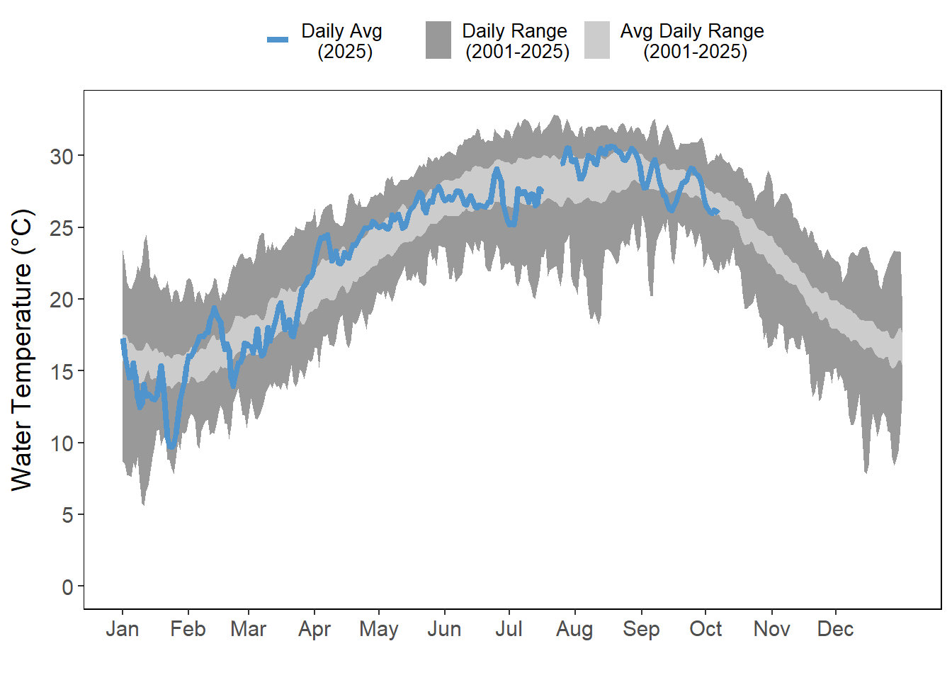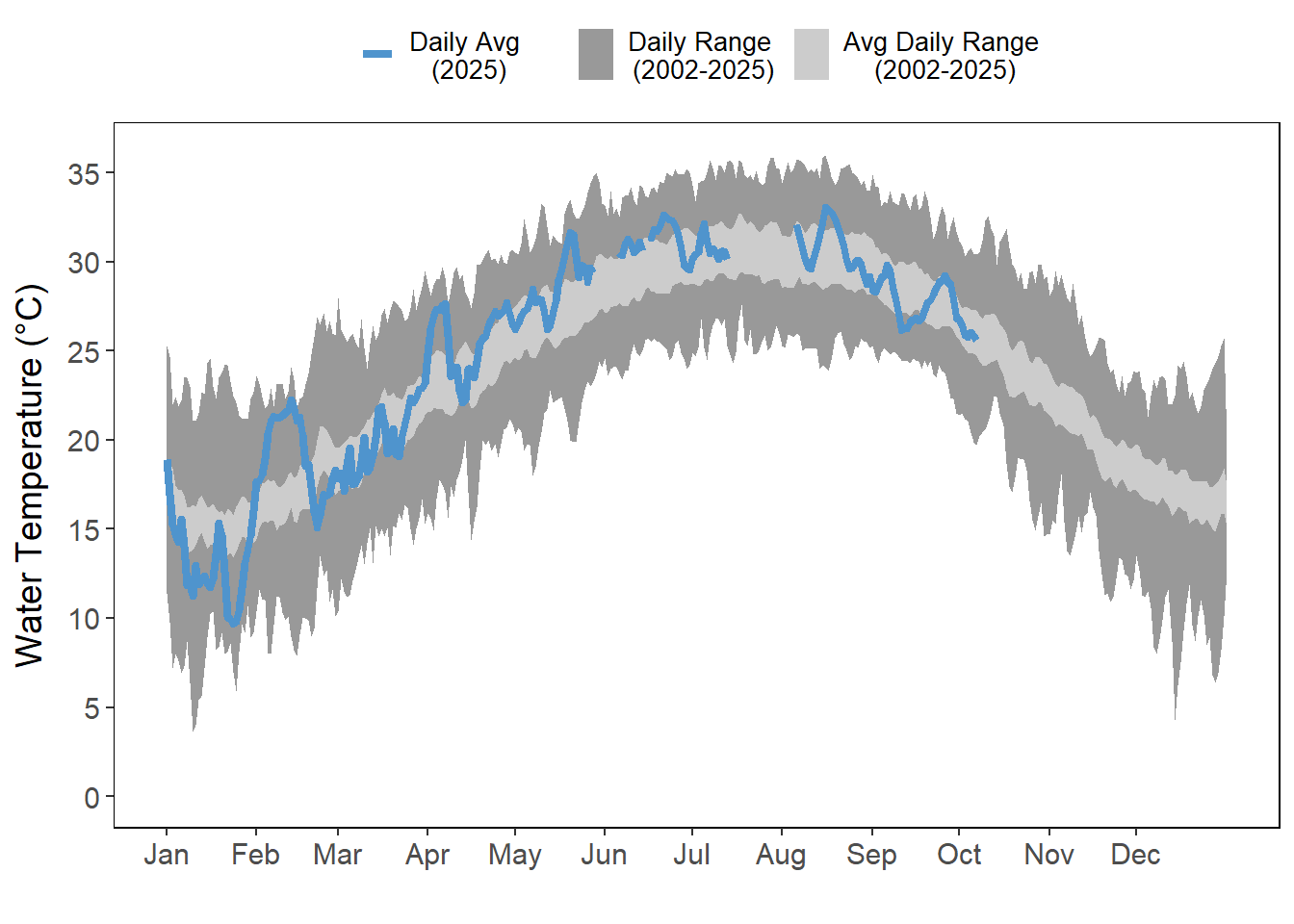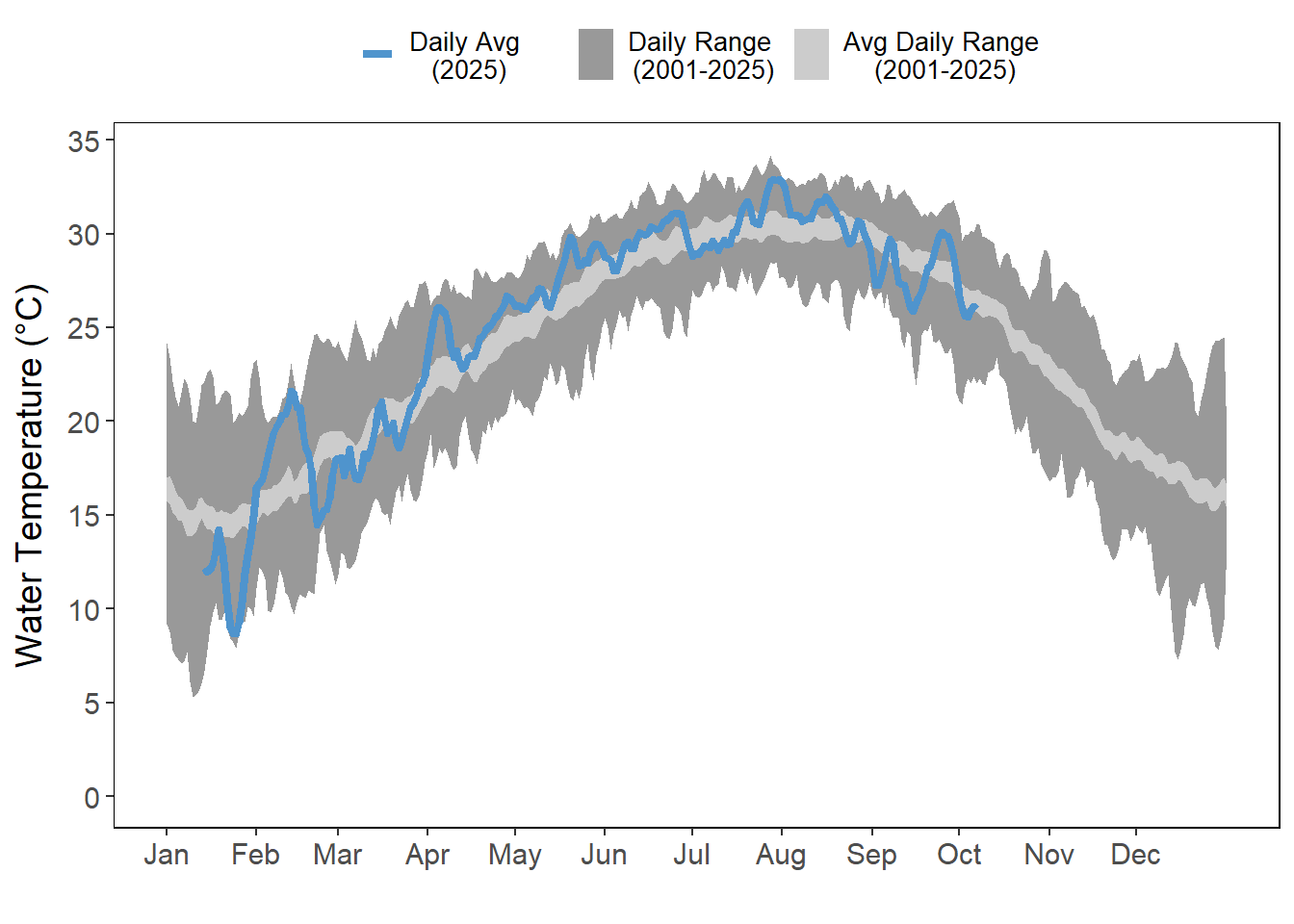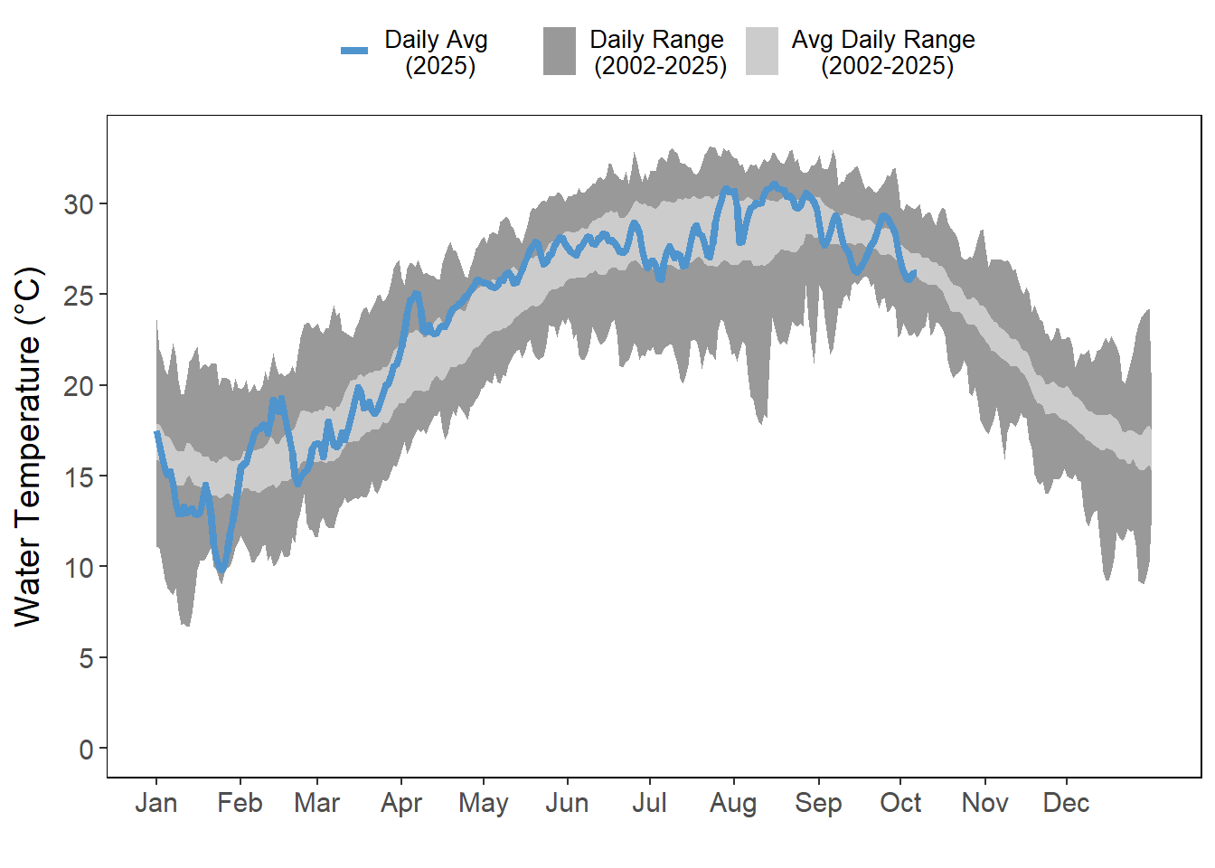 Air and water temperatures are presented as daily averages (blue line) with historic ranges (daily range and average daily range) provided in shades of gray.