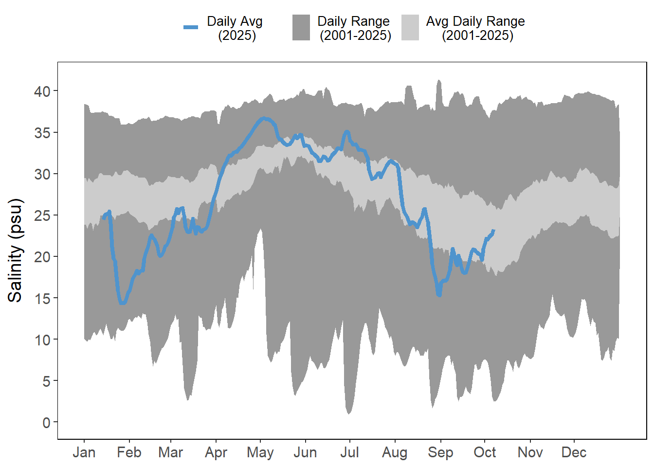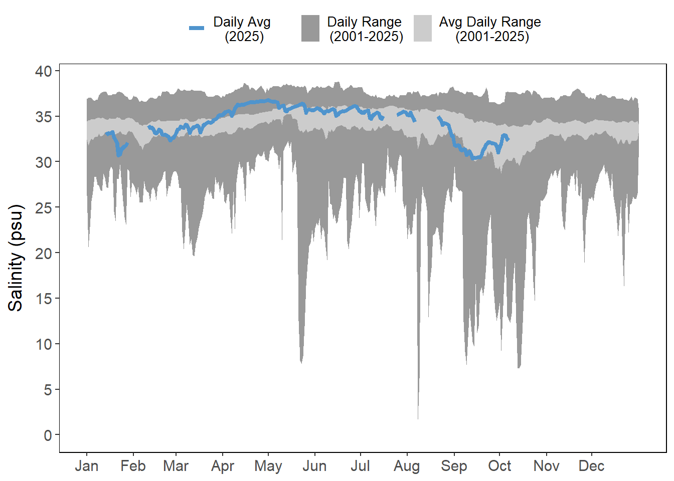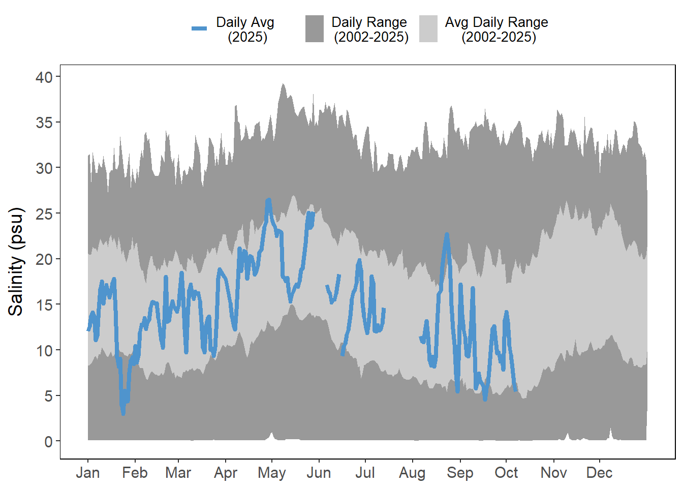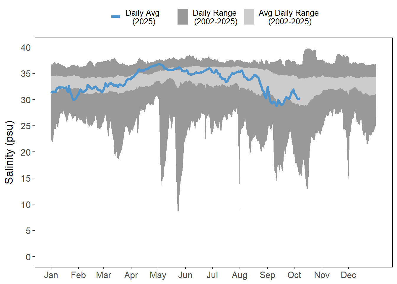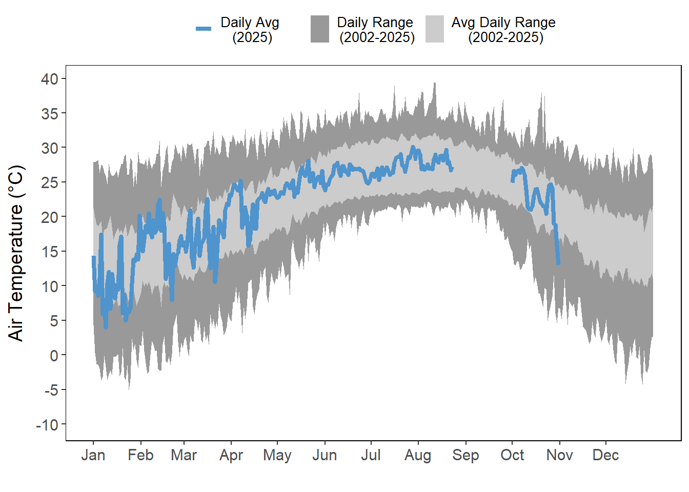 Air and water temperatures are presented as daily averages (blue line) with historic ranges (daily range and average daily range) provided in shades of gray.